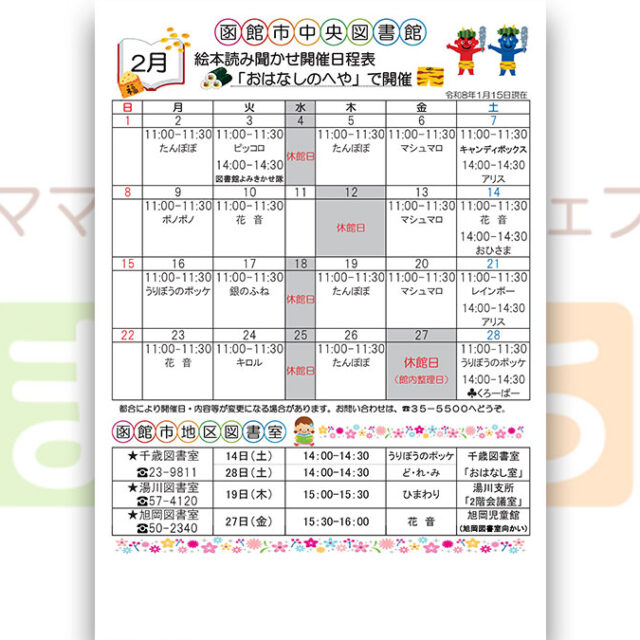 函館市中央図書館、函館市地区図書室の2026年2月の絵本読み聞かせ開催日程です♪