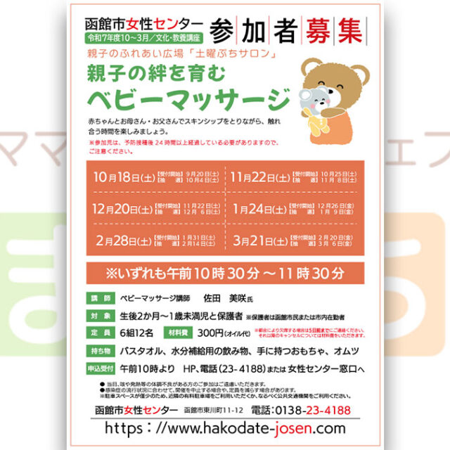【函館市女性センター】親子の絆を育むベビーマッサージ(12月)