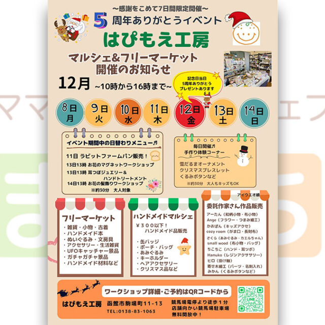 2025年12月8日(月)~14日(日)【はぴもえ工房 5周年記念イベント】が開催されます♪フリーマーケットやハンドメイドマルシェ、ワークショップなど楽しい企画たくさん!