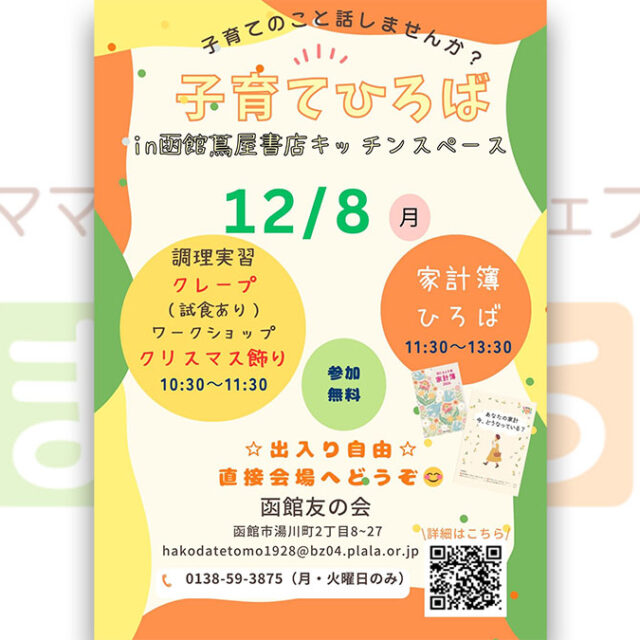 2025年12月8日(月)【函館友の会】子育てひろばin函館蔦屋書店が開催されます♪子育ての話をしたり、試食ありの料理実習(今回はクレープ!)などみんなで楽しく交流できます♪