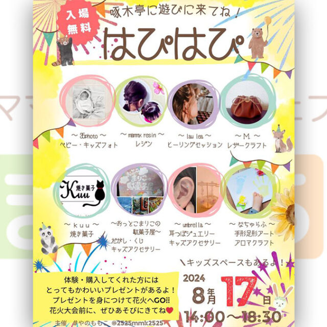 イベント 啄木亭に遊びに来てね!「はぴはぴ」 8月17日(土) 2024年8月17日(土)【啄木亭に遊びにきてね!はぴはぴ】体験・購入してくれた方にはプレゼントもありますよ♪ おやこショッピング体験 2024.07.22 おやこイベント