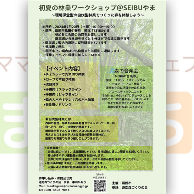 イベント 初夏の林業ワークショップ@SEIBUやま 7月20日(土) 開催場所 函館市亀田中野町 通称「SEIBUやま」環境保全型の自伐型林業でつくった森を体験しよう自伐型林業とは…自らの手でチェーンソーと軽トラを使い、人間の手で木々と対話しながら、山を守るなりわい。小規模であり身近に木々を感じられる時間を過... おやこ体験 2024.07.16 おやこイベント
