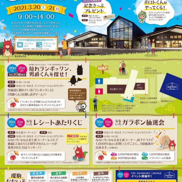 イベント 道の駅 なないろ・ななえ 3周年祭 3月20日(土)~3月21日(日) 3月20日(土・祝)、21日(日)、道の駅なないろななえでオープン3周年祭が開催されます♪美味しい楽しいをつめこんだ2日間♪皆様ぜひ足を運んでみてください(*^^*) おやこキッズ 2021.03.15 おやこイベントキッズ