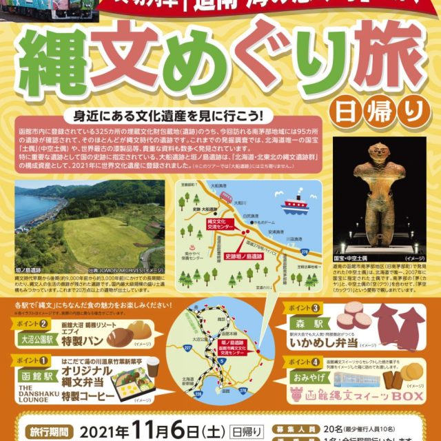 イベント 貸切列車「道南海の恵み号」で行く 縄文めぐり旅 11月6日(土) 11月6日(土)函館駅発着、貸切列車「道南海の恵み号」で行く 縄文めぐり旅をご紹介しています。縄文にちなんだ食を他のs見ながら道南を巡ります♪ おやこキッズパパプレママママ体験学ぶ見る 2021.10.25 おやこイベントキッズパパプレママママ
