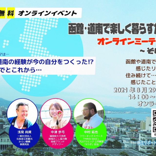 イベント 函館・道南で楽しく暮らすためのオンラインミーティング 8月29日(日) 2021年8月29日(日)「函館・道南で楽しく暮らすためのオンラインミーティング」テーマは、「函館・道南の経験が今の自分をつくった!?これまでとこれから…」。魅力的な3人のゲストに函館や道南に移住・Uターンしたリアルな体験談、暮らしをご紹介いただきます。 パパプレママママ学ぶ 2021.08.16 イベントパパプレママママ