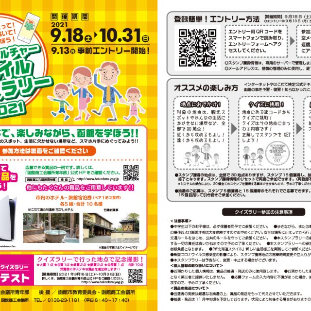 イベント はこだてカルチャー モバイルクイズラリー2021 9月18日(土)~10月31日(日) 10月31日まで開催されている【はこだてカルチャーモバイルクイズラリー2021】クイズに答えてスタンプゲット♪スタンプが集まると素敵な賞品をに応募できます(^^)/ パパプレママママ学ぶ 2021.09.29 イベントパパプレママママ