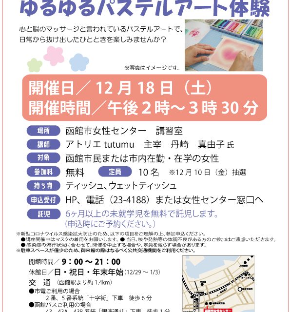 イベント ホットスペース ゆるゆるパステルアート体験 12月18日(土) 函館市女性センターで12月18日(土)に開催のホットスペース ゆるゆるパステルアート体験をご紹介しています♪ プレママママままのみかた体験作る 2021.11.29 イベントプレママママ