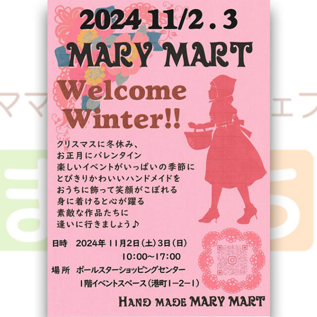 イベント MARY MART 11月2日(土)~11月3日(日) 2024年11月2日(土)3日(日)【MARY MART】人気のハンドメイド作家さんによるショップ・ワークショップのイベントです♪ おやこプレママママショッピング体験 2024.10.30 おやこイベントプレママママ