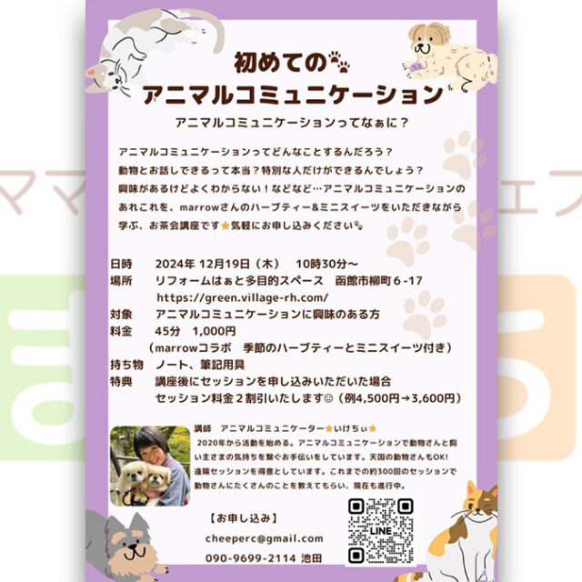 イベント 初めてのアニマルコミュニケーション 12月19日(木) 2024年12月19日(木)【初めてのアニマルコミュニケーション】が開催されます♪ プレママママ 2024.12.09 イベントプレママママ