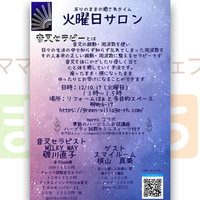 イベント ありのままの癒されタイム「火曜日サロン」 12月10日(火)~12月17日(火) 2024年12月10日(火)17日(火)【ありのままの癒されタイム「火曜日サロン」】が開催されます♪音叉の振動・周波数を使ったセラピーです。 プレママママ体験 2024.12.09 イベントプレママママ