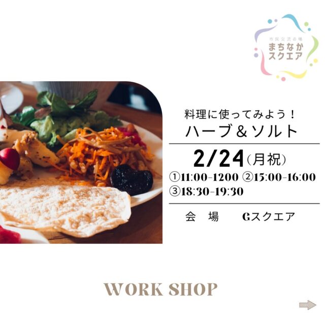 イベント 料理に使ってみよう!ハーブ&ソルト 2月24日(月) 2025年2月24日(月祝)【料理に使ってみよう!ハーブ&ソルト】がGスクエアで開催されます♪手作りハーブソルトを使った栄養価の高いミニワンプレートを試食しながら、ハーブについて学びませんか? プレママママ作る 2025.02.03 イベントプレママママ