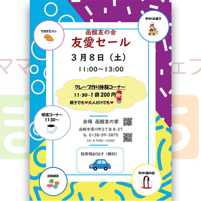 イベント 【函館友の会】友愛セール 3月8日(土) 2025年3月8日(土)【函館友の会 友愛セール】が開催されます♪函館友の会 会員の手作り品や焼き立てパン、喫茶コーナーそして親子に楽しんでほしい「クレープ作り体験コーナー」など♪ おやこプレママママショッピング体験 2025.03.04 おやこイベントプレママママ