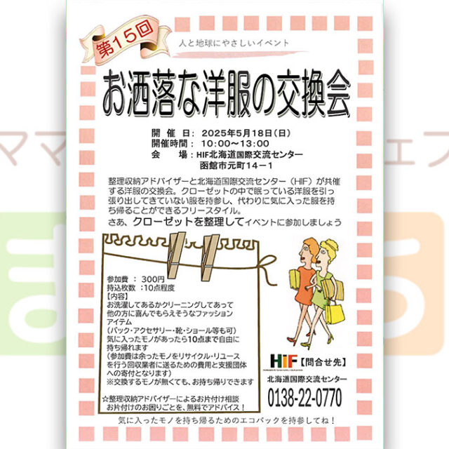 イベント 第15回 お洒落な洋服の交換会 5月18日(日) 2025年5月18日(日)【第15回 お洒落な洋服の交換会】が開催されます♪クローゼットの中で眠っている洋服を持参し、代わりに気に入った服を持ち帰ることができるフリースタイル交換会です。 おやこプレママママショッピング 2025.04.22 おやこイベントプレママママ