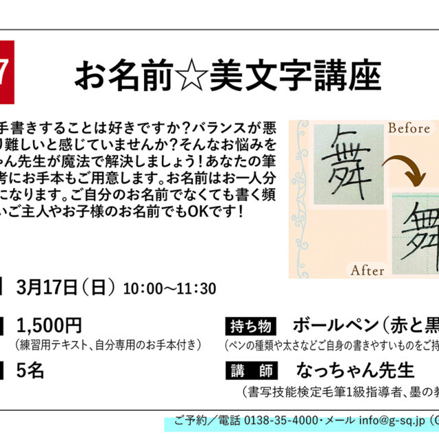 イベント 【Gスクエア】お名前☆美文字講座 3月17日(日) 2024年3月17日【Gスクエア:お名前☆美文字講座】お子さんの名前を書く機会が多いシーズン!美文字講座で綺麗に書こう! プレママママ学ぶ 2024.03.05 イベントプレママママ