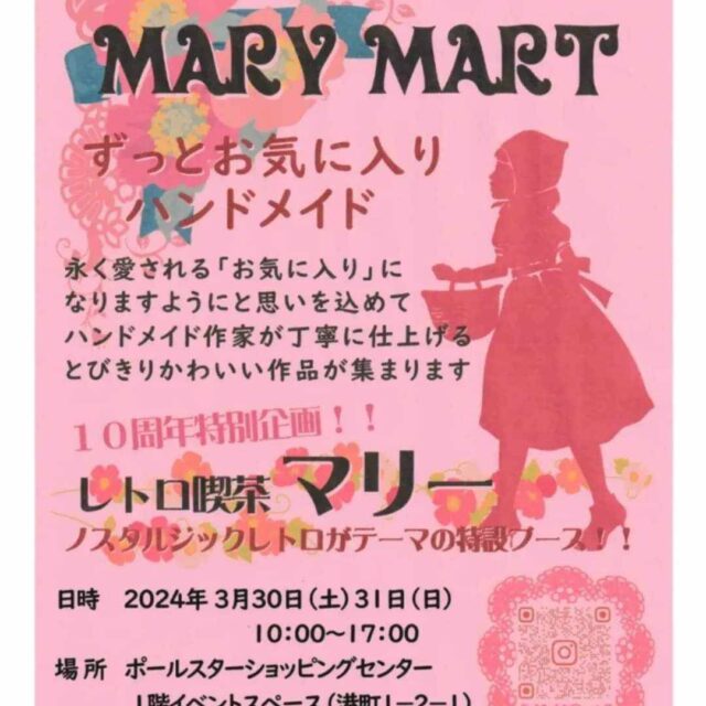 イベント MARY MART 3月30日(土)~3月31日(日) 2024年3月30日(土)31日(日)【MARY MART】人気のハンドメイド作家さんによるショップ・ワークショップのイベントです♪ おやこプレママママショッピング体験 2024.03.28 おやこイベントプレママママ