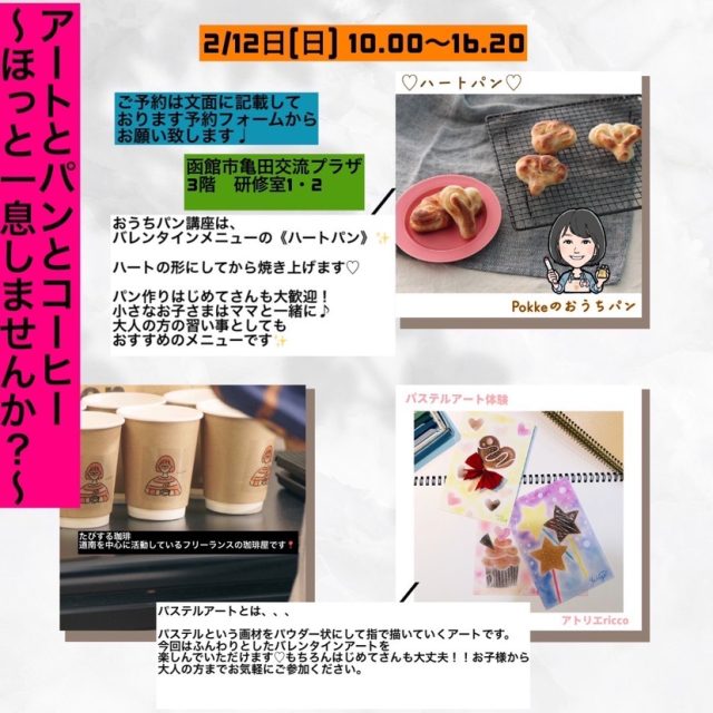 イベント アートとパンとコーヒー 2月12日(日) 2023年2月12日(日)【アートとパンとコーヒー】が函館市亀田交流プラザで開催されます♪バレンタイン間近にそれぞれ違うジャンルの3人が企画したコラボイベントです♪ おやこプレママママ作る食べる 2023.01.19 おやこイベントプレママママ
