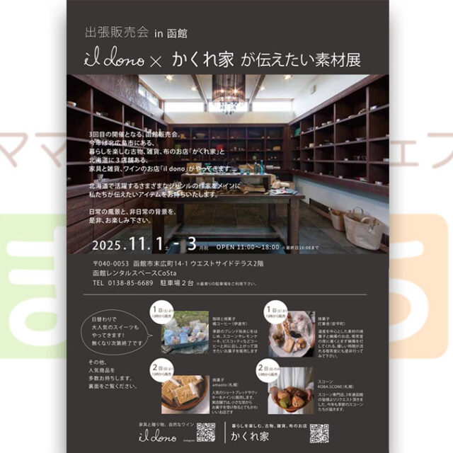 イベント ildono × かくれ家が伝えたい素材展 11月1日(土)~11月3日(月) 2025年11月1日(土)~3日(月祝)【ildono × かくれ家が伝えたい素材展】が開催されます♪ おやこプレママママショッピング 2025.10.16 おやこイベントプレママママ