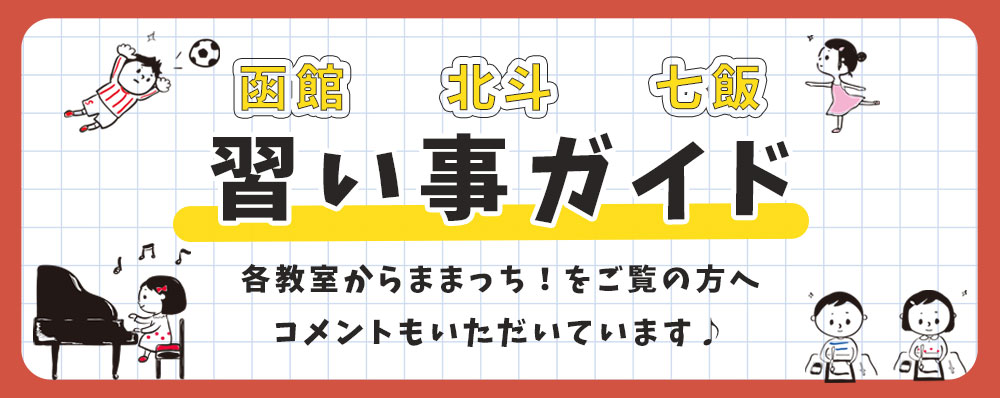 習い事ガイド 函館・北斗・七飯の【子どもの習い事】情報をわかりやすくご紹介!教室の様子が分かる写真や、気になる料金・対象年齢・時間曜日の他、ままっち!をご覧の皆様へコメントもいただいています。お子さんの習い事選びの参考に是非ご活用ください! 「習い事ガイド」掲載に関するお問い合わせはこちらから 学習 スポーツ 音楽