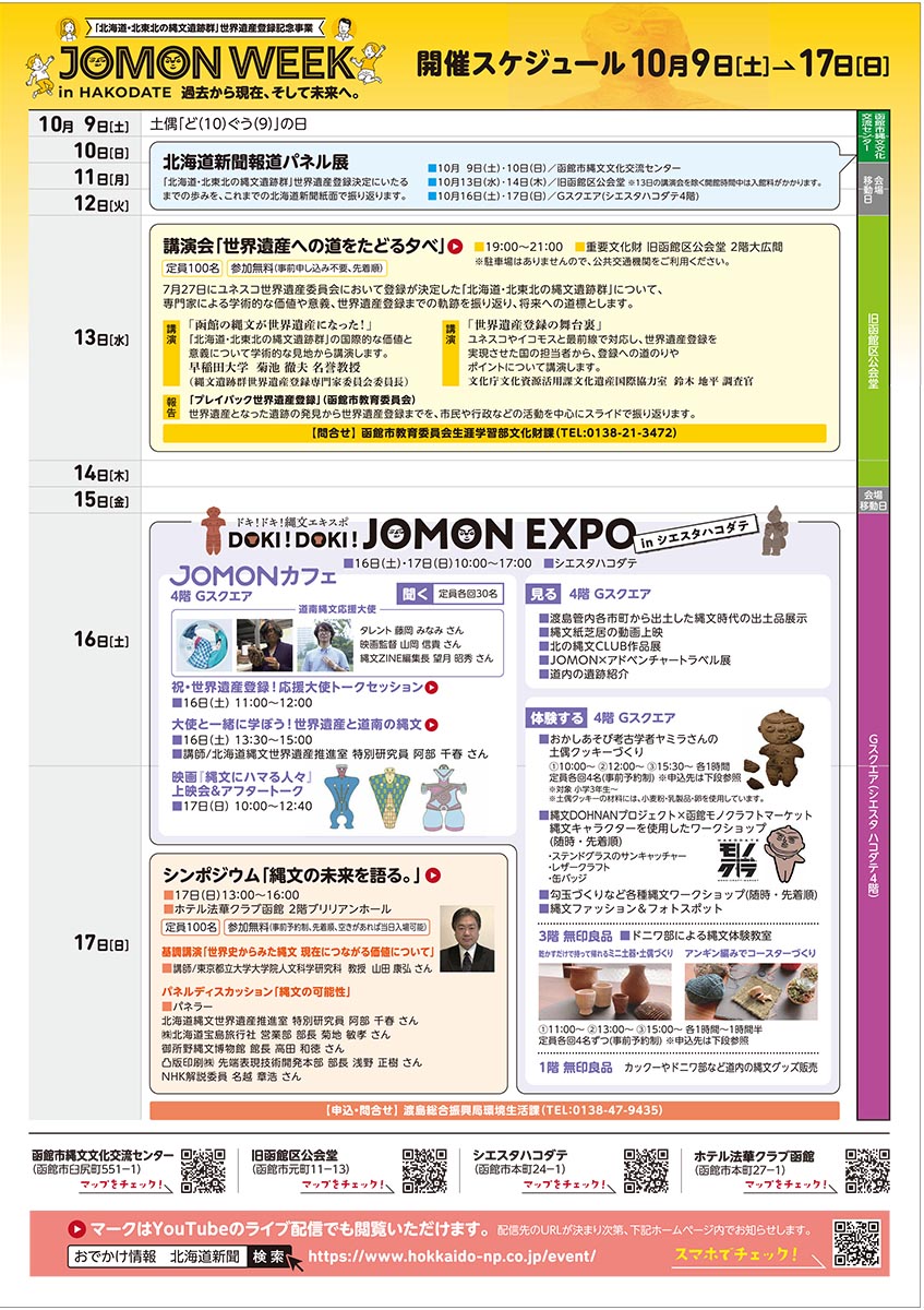 世界遺産登録までの軌跡をたどる報道パネル展や、講演会、トークショーなどの他に、シエスタハコダテ4階Gスクエアでは、土偶クッキーづくり(対象:小学3年生~)、モノクラによる縄文キャラクターを使用したワークショップなど子どもも楽しめるプログラムも開催されます。