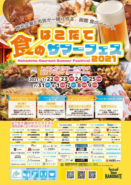 はこだて食のサマーフェス2021 イベント 2021.06.29 2021年7月22日(木)~2021年8月9日(月) 開催場所 はこだてグリーンプラザB.Cブロック(函館市松風町10-62) 地元企業と函館市民が一緒に作る、函館 食のイベント バル街を一ヵ所で楽しめる【居酒屋フェス】、函館の有名カレー店が集結する【カレーフェス&肉フェス】、ビアガーデンも楽しめる【函館うまいもん祭り】、農産品や土産品が集まる【函館マルシェ】などなど♪ おいしいものが大集結するイベントが3週にわたって開催です(*^^*) ※このイベントは終了しました※