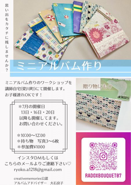 ワークショップでは、お好きな絵柄のミニアルバムを選んで、写真3~6枚を貼っていただきます。