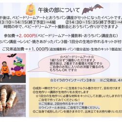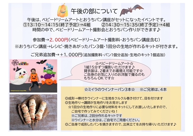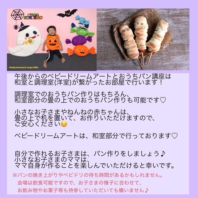 午後からは、初!のおうちパン講座とベビードリームアートがセットでお楽しみいただけますよ☺️🎃