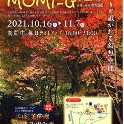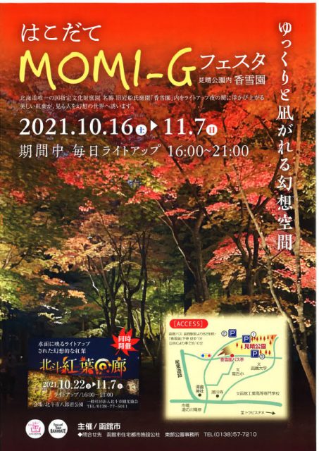 今年も函館市の見晴公園でMOMI-Gフェスタが開催です♪期間中、香雪園内がライトアップ。きれいな紅葉が夜の闇に浮かび上がり見る人を幻想の世界に誘います。