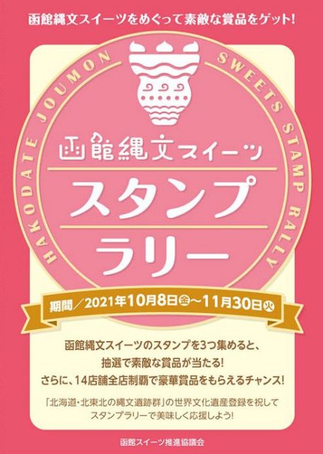 函館・道南のスイーツ店を巡り、「函館縄文スイーツ」を“発掘”するイベント、「函館縄文スイーツ・スタンプラリー」を2021年10月8日(金)~11月30日(火)に実施いたします。期間中に対象14店舗で函館縄文スイーツや函館縄文アイスをご購入いただくと、スタンプラリー応募台紙にスタンプを押印します。3つ以上のスタンプを集めてご応募いただいた方の中から抽選で20名様に「スイーツ・詰め合わせ」(1,500円相当)を、さらに全14店舗のスタンプを集めてご応募いただいた方の中から抽選で5名様に、全店制覇賞として「スペシャルスイーツ・詰め合わせ」 (5,000円相当)をプレゼントいたします。 秋深まる函館の街歩きとともに、ぜひご参加ください。