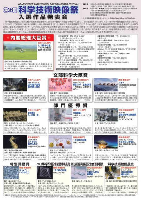 科学技術映像祭は、優れた科学技術映像を選奨することで科学技術への関心を喚起するとともに、その普及と向上をはかり、社会一般の科学技術教養の向上に資することを目的として昭和35(1960)年より開催し今回、第62回を迎えました。科学技術映像祭 (jsf.or.jp)