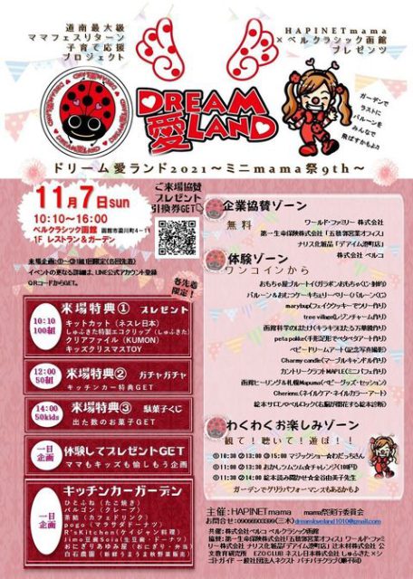 DREAM愛LAND2021~ミニmama祭9th~ イベント 2021.10.28 2021年11月7日(日) 開催場所 ベルクラシック函館 1Fレストラン&ガーデン mama祭が復活! ママも嬉しい来場特典や、クレープ・たこ焼き・カフェドリンクなど美味しいものが集結するキッチンカーガーデン、ワンコインから体験できるワークショップなど、楽しい催し盛りだくさん! マジックショーなどのお楽しみゾーンもありますよ♪ 時間 10:10~16:00 ※このイベントは終了しました※