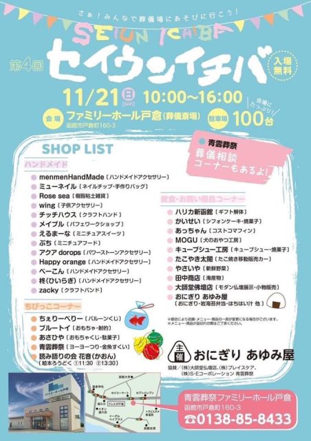 たくさんのショップが集まったハンドメイドコーナー、たこ焼きやおにぎり、焼き菓子などの飲食コーナーに、ギフト解体などお買い得品コーナーまで!
