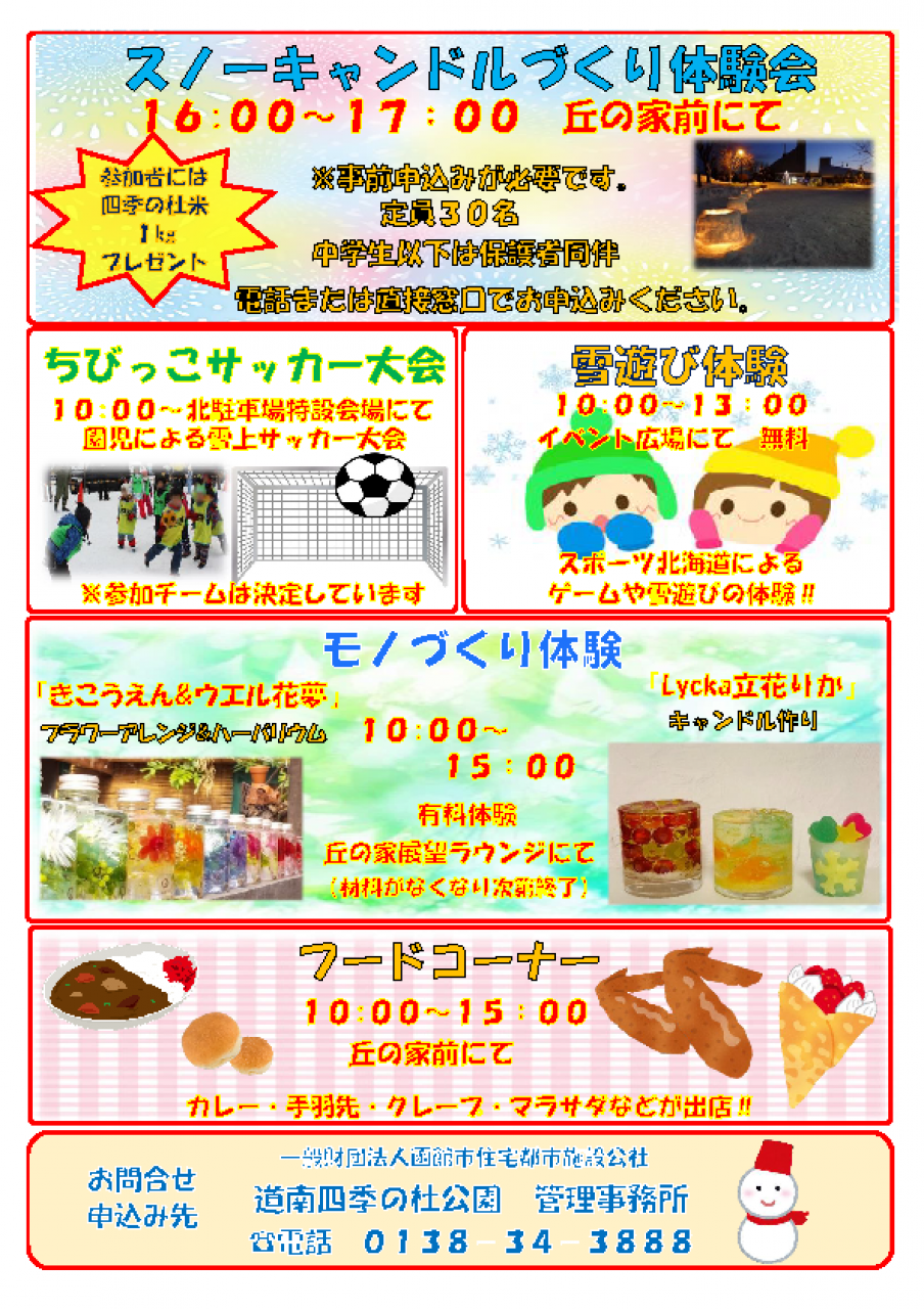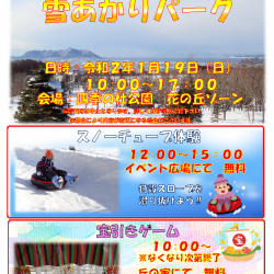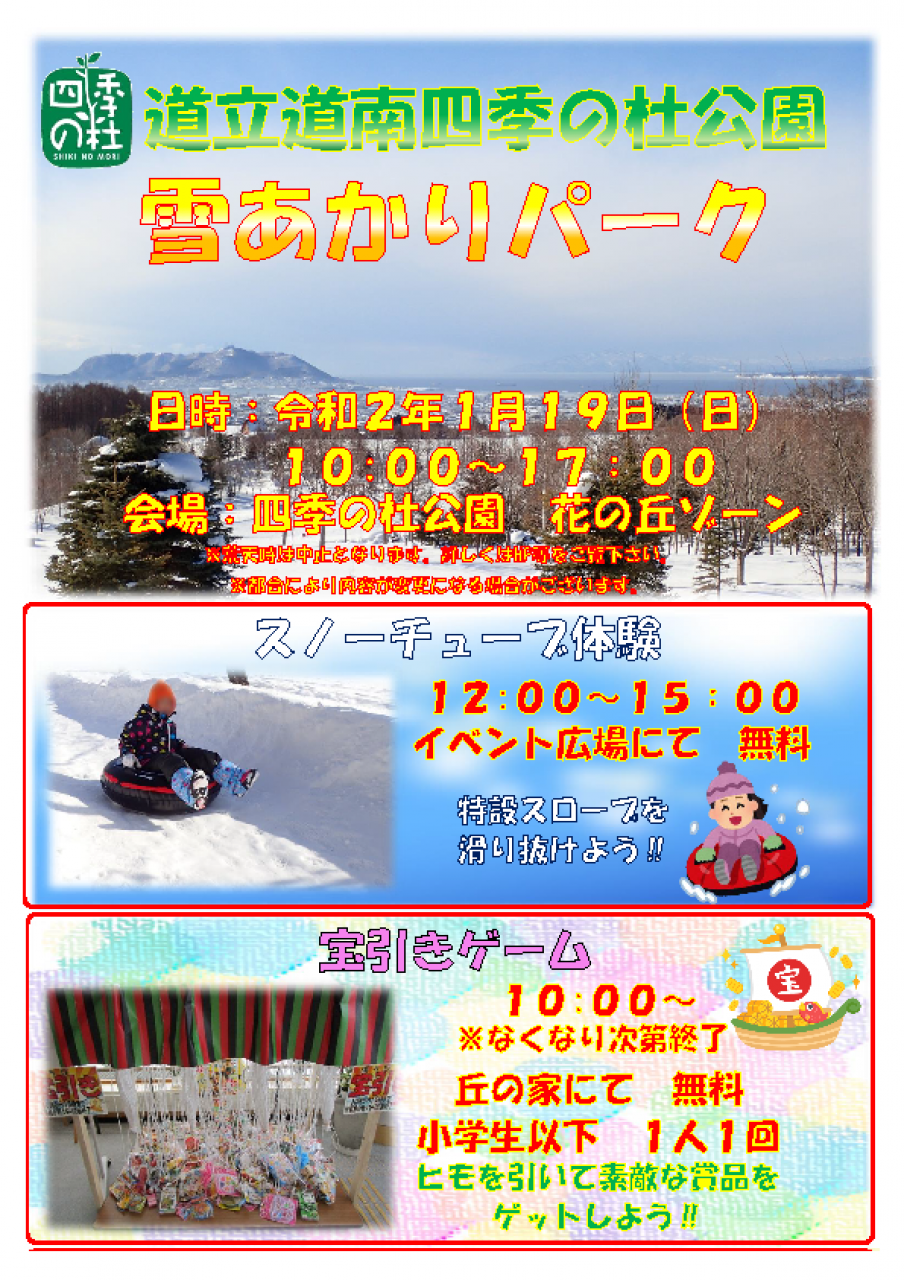 道南四季の杜公園雪あかりパーク イベント 2019.12.27 2020年1月19日(日) 開催場所 道南四季の杜公園 花の丘ゾーン スノーチューブ体験(無料で貸し出し)、ゲームや雪遊び体験など冬の公園を満喫できます(^^)/ ※積雪が少ないため、「スノーチューブ体験」のみ中止。他のゲーム、体験は予定通り開催されます。(2020年1月14日追記) 時間 10:00~17:00 ※このイベントは終了しました※