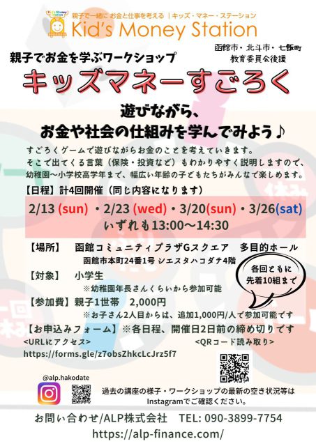 すごろくゲームで遊びながらお金のことを考えていきます。そこで出てくる言葉(保険・投資など)もわかりやすく説明しますので、幼稚園~小学校高学年まで、幅広い年齢の子どもたちがみんなで楽しめます。2月、3月と計4回、同内容で開催です♪過去の講座の様子・ワークショップの最新空き状況等はInstagramでご確認ください。