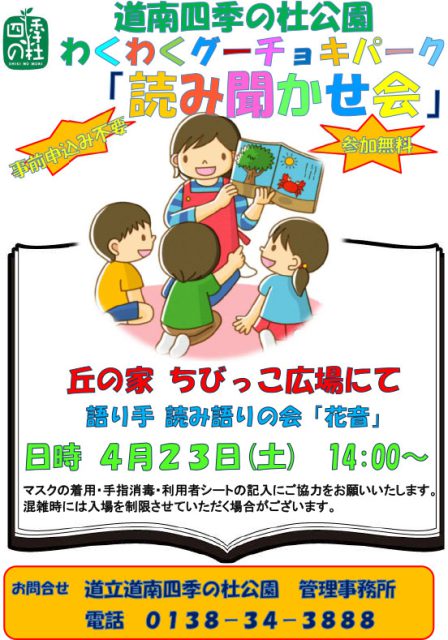 丘の家ちびっこ広場におきまして、わくわくグーチョキパーク『読み聞かせ会』を開催いたします!今回は、『読み語りの会 花音』さんによる読み聞かせです。入場は無料です!ぜひお越しください。