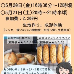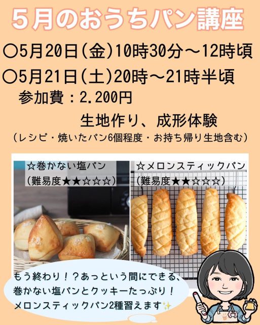持ち物 筆記用具、エプロン、手を拭くタオル、飲み物(必要な方)、保冷バックと凍らせた保冷剤(講座内で作った生地をお持ち帰りいただきます)