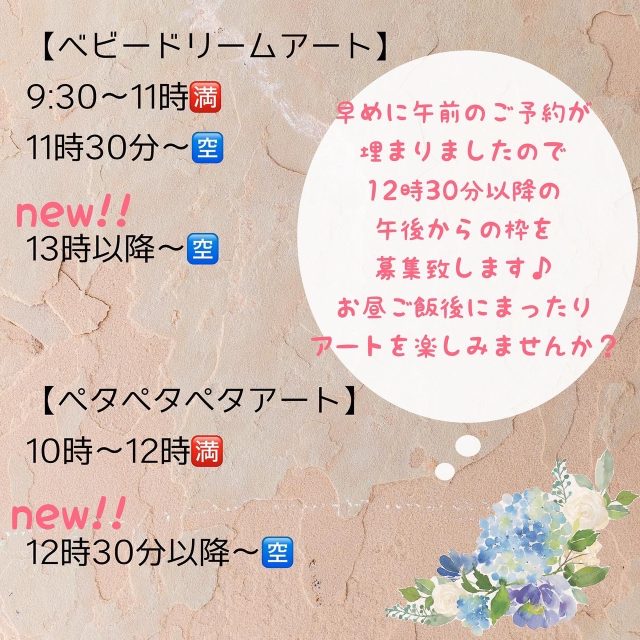 時間 ベビードリームアート 11:30~、13:00以降~ ペタペタアート 12:30以降~