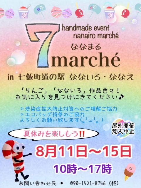 7marche(ななまる) イベント 2022.07.27 2022年8月11日(木)~2022年8月15日(月) 開催場所 七飯町道の駅 なないろ・ななえ 夏休みを楽しもう!8月も元気いっぱい【ななまる】開催🌈 りんご・なないろ作品色々♪函館・近郊のハンドメイド作品が大集合です♪お気に入りの作品を見つけに来てください!※屋外開催 荒天中止 時間 10:00~17:00 ※このイベントは終了しました※