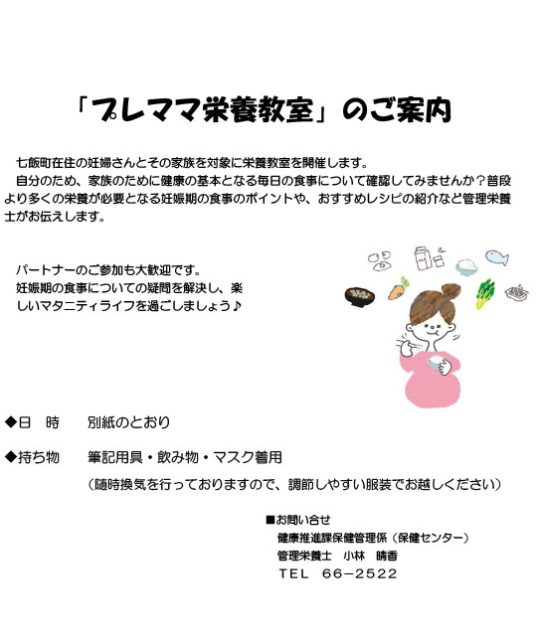 七飯町在住の妊婦さんとその家族を対象に栄養教室を開催します。自分のため、家族のために健康の基本となる毎日の食事について確認してみませんか?普段より多くの栄養が必要となる妊娠期の食事のポイントや、おすすめレシピの紹介など管理栄養士がお伝えします。
