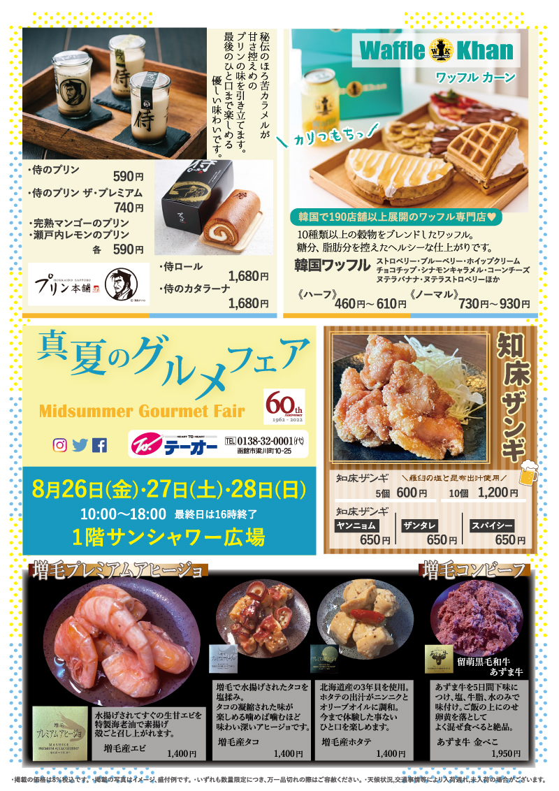 甘さ控えめのプリンに秘伝のほろ苦カラメルがおいしい【プリン本舗 侍プリン】や、韓国で190店舗以上展開しているワッフル専門店【Wafflekhan(ワッフルカーン)】、羅臼の塩と昆布出汁が美味な【知床ザンギ】、増毛のエビやタコの入った【増毛プレミアムアヒージョ】など、食欲のそそる美味しいものが集合します!