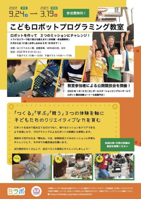 こどもロボットプログラミング教室 イベント 2022.09.02 2022年9月24日(土)~2023年3月19日(日) 開催場所 はこだてみらい館・函館高専・MIRAIBASEほか 「つくる」「学ぶ」「競う」3つの体験を軸に子どもたちのクリエイティブな力を育む♪ ロボットを作って3つのミッションにチャレンジ!トライ&エラーで粘り強さを鍛えます。 9月から全12回開催。教室参加者による公開競技会も開催予定。 対象 ロボットに興味のある小学生から高校生まで 参加料 無料 定員 各クラス10名 申込受付 9月18日(日)締切 ※このイベントは終了しました※