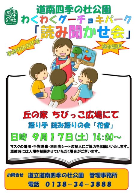 わくわくグーチョキパーク『読み聞かせ会』 イベント 2022.09.15 2022年9月17日(土) 開催場所 道立道南四季の杜公園 丘の家 ちびっこ広場 丘の家ちびっこ広場におきまして、わくわくグーチョキパーク『読み聞かせ会』を開催いたします! 今回は、『花音』さんによる読み聞かせです。入場は無料! ぜひお越しください。 ※マスクの着用・手指消毒・利用者シートの記入にご協力をお願いいたします。 混雑時には入場を制限させていただく場合がございます。 時間 14:00~ 参加料 無料 申込受付 事前申込み不要 ※このイベントは終了しました※