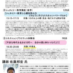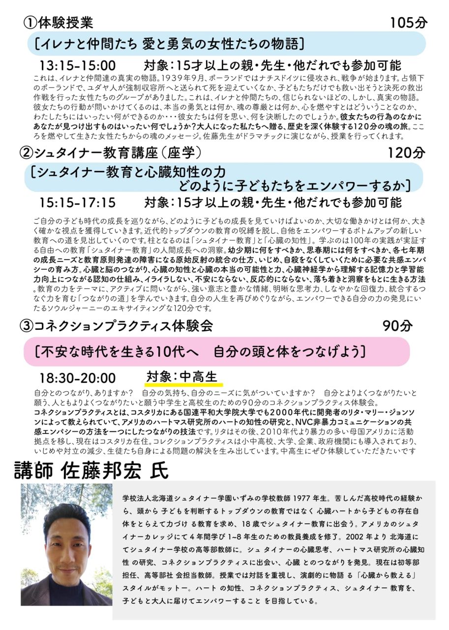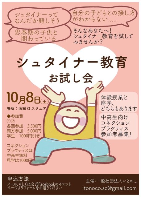本イベントでは、豊浦のシュタイナー学校で歴史と演劇を教えている佐藤先生が函館に来てくださりシュタイナー教育の体験ができるイベントとなっています。当日は3部構成で行い、体験授業のほかにもシュタイナー教育に関する講座や中高生向けの体験会も行います。