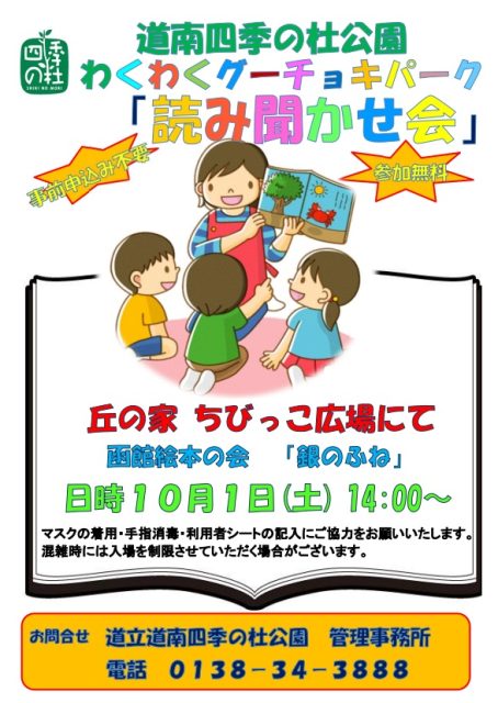 わくわくグーチョキパーク『読み聞かせ会』 イベント 2022.09.29 2022年10月1日(土) 開催場所 道立道南四季の杜公園 丘の家 ちびっこ広場 丘の家ちびっこ広場におきまして、わくわくグーチョキパーク『読み聞かせ会』を開催いたします! 今回は、函館絵本の会『銀のふね』さんによる読み聞かせです。入場は無料! ぜひお越しください。 ※マスクの着用・手指消毒・利用者シートの記入にご協力をお願いいたします。 混雑時には入場を制限させていただく場合がございます。 時間 14:00~ 参加料 無料 申込受付 事前申込み不要 ※このイベントは終了しました※