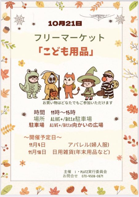 フリーマーケット こども用品 イベント 2022.10.18 2022年10月21日(金) 開催場所 ALIVE+Bitte駐車場(七飯町大川5丁目2−39) 誰かの捨てるものが、誰かのお気に入りに♪こども用品のフリーマーケットを開催します。お野菜の販売もありますよ。掘り出し物に出会えるかも! 時間 11:00~15:00 ※このイベントは終了しました※