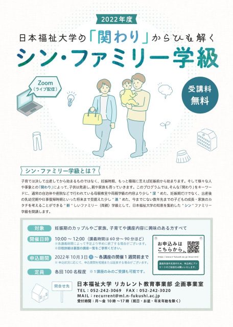 親になること、家族が増えること、子ども・家族との生活や将来のことについてなど、正しい知識をもとに一緒に考えるコンテンツシリーズとして「日本福祉大学の『関わり』からひも解くシン・ファミリー学級」を無料で開講します。