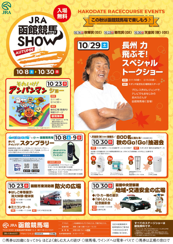 プロレス界のレジェンド、長州力さんが登場!また、函館中央警察署の地域・交通安全の広場もやってくる♪パトカーの展示のほか、「ほくとくん」との記念撮影会も開催です。