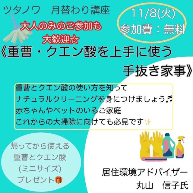11月のツタノワは、通常の講座は満席ですが、下記の講座を募集中です😊ツタノワの雰囲気を知るきっかけにもなりますので初めましてのご参加も大歓迎ですよ〜😍もちろん親子だけではなく、ママ、パパの大人様のみのご参加も可能です😊良かったらこの機会にお話聞いてみませんか?🧹🧼