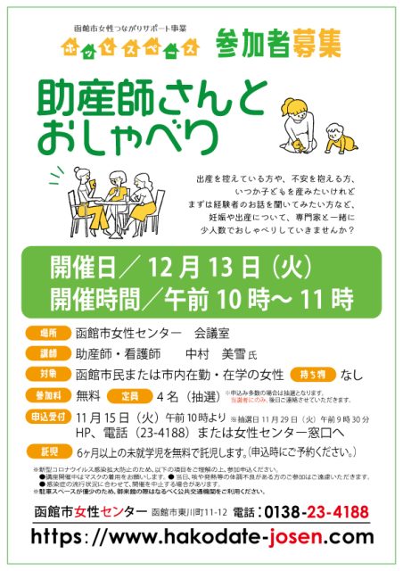 申込受付 HP、電話、または女性センター窓口へ 11月15日(火)10時より ※抽選日 11月29日(火)9:30~