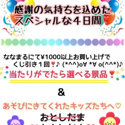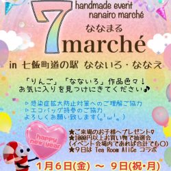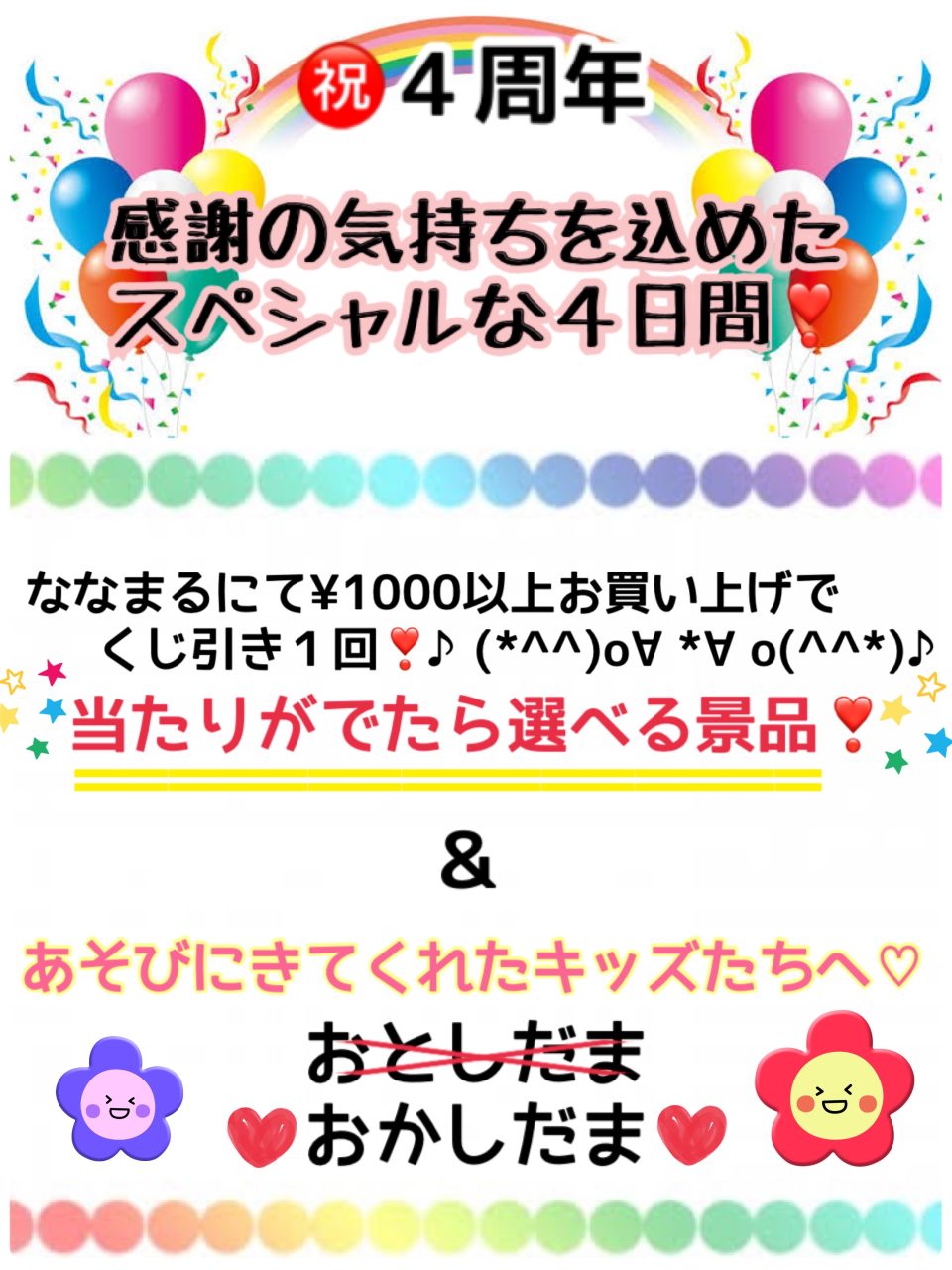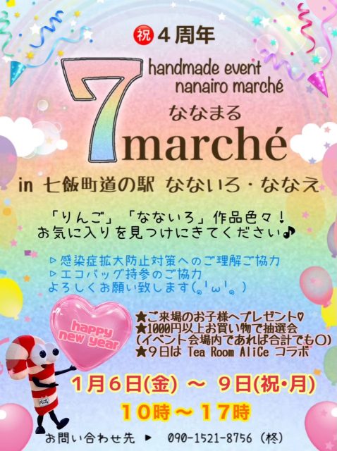 人気のハンドメイドイベントななまるが4周年を迎えました♪感謝の気持ちを込めたスペシャルな4日間♪ななまるにて1,000円以上お買い上げでクジ引き1回!当たりが出たら選べる景品&遊びに来てくれたお子様にはお菓子をプレゼント♪9日はTea Room Aliceとコラボ!新年のスタートはななまるでお気に入りの作品を見つけに来ませんか(^^)/