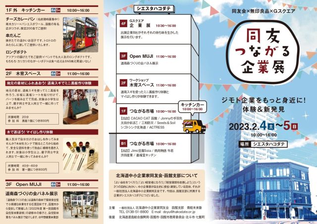 同友会 函館支部に所属する企業がシエスタハコダテにつどい、それぞれの持ち味を生かした展示を行うほか、無印良品では道南スギでミニ黒板作り体験ができるワークショップも開催♪
